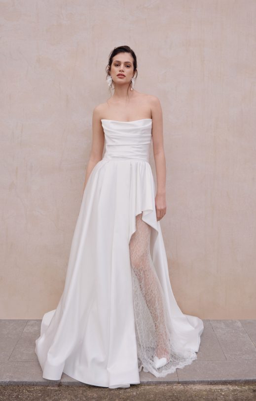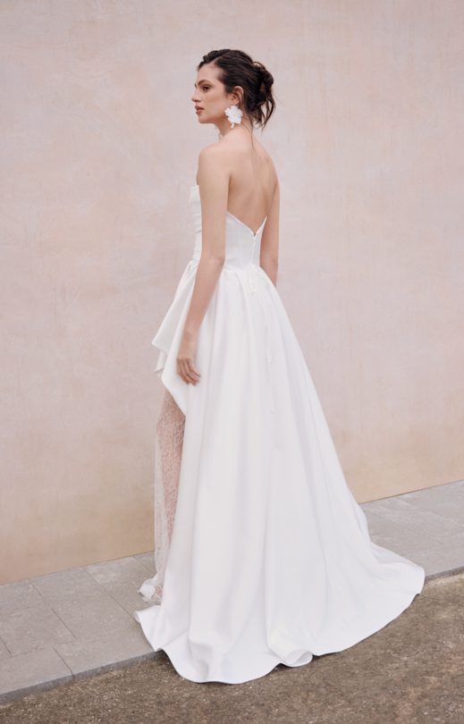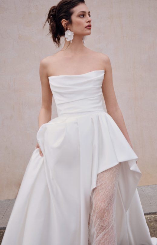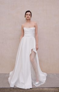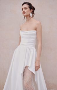 Платье из атласной ткани дополнено корсетным лифом с элегантной шнуровкой на спине. Перед украшен мягкой драпировкой. Асимметричная юбка состоит из двух слоев: внутреннего, выполненного из жесткого фатина, который придает форму, и внешнего. Низ юбки обработан специальной лентой жесткости для поддержания формы.
