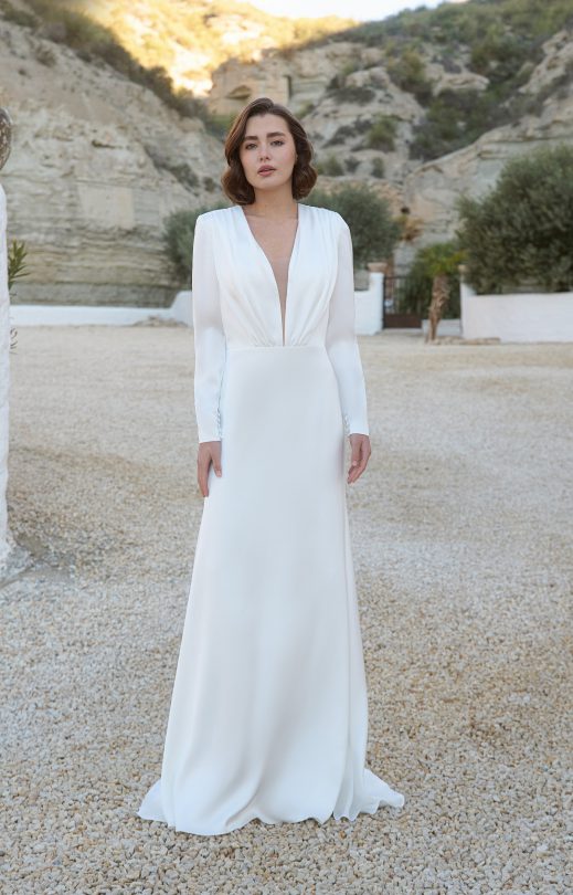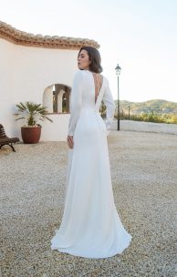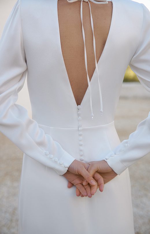 Платье силуэта полурыбка с длинными рукавами выполнено из шелкового крепа. Лиф по переду с мягкой драпировкой, спереди и сзади глубокие V-образные вырезы. На спинке в верхней части завязка. Застежка-молния, вдоль которой пришиты обтяжные пуговички.