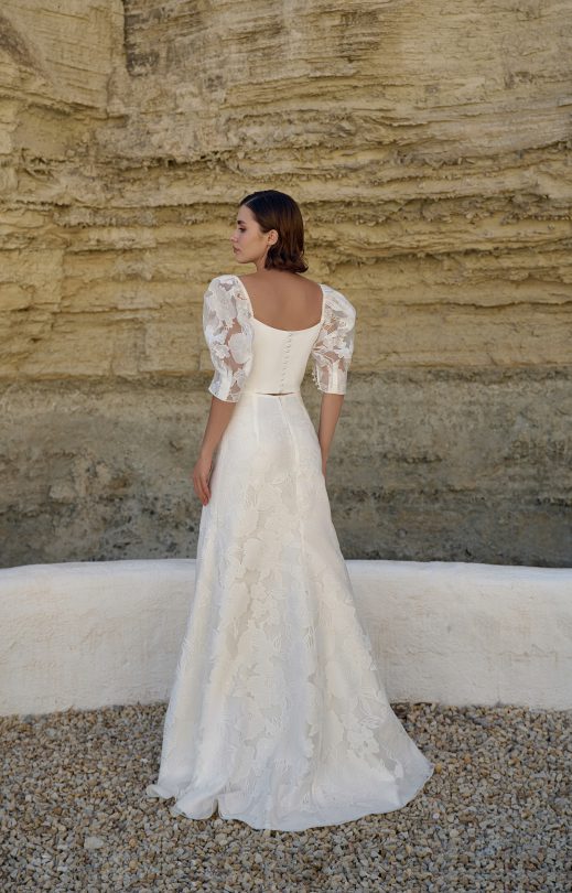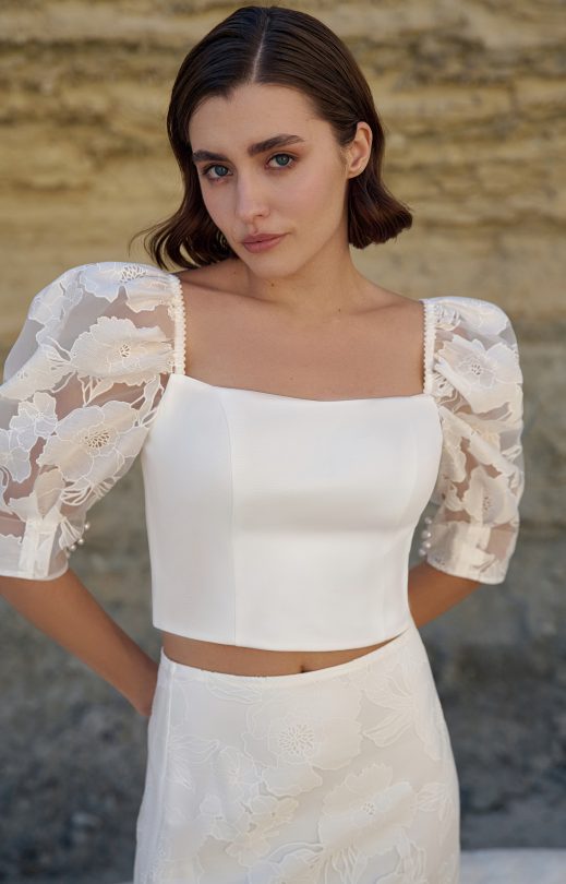 Топ выполнен из матиса, рукава из органзы с цветочным принтом. На спинке застежка на жемчужные пуговички. Рукав по окату с декоративной резиночкой, снизу застегивается на жемчужные пуговички. Юбка-полурыбка выполнена из органзы с цветочным принтом. Застежка-молния сзади.