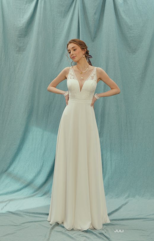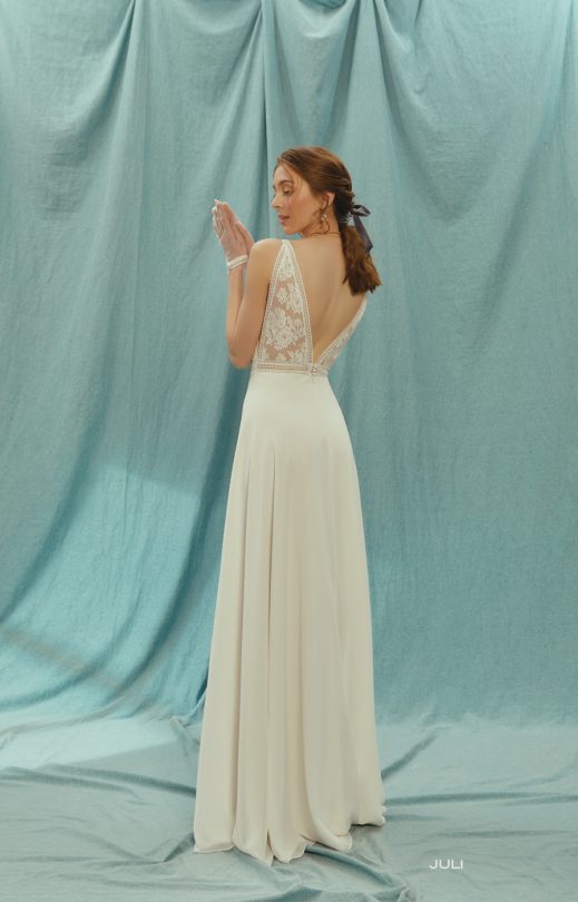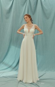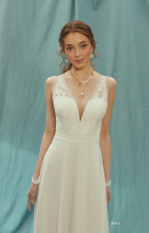 Легкое свадебное платье из гипюра в цветочные букетики, который сочетается с ровной кружевной каймой. Вырезы переди и спинка V-образные, подчеркнуты каймой. Линия талии также очерчена кружевной каймой, имитирующей пояс. Юбка-полу-солнце, шифон.
