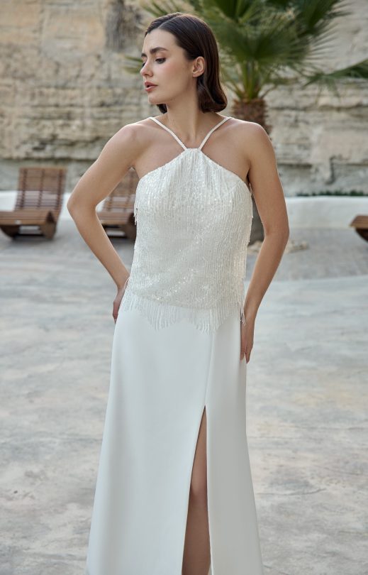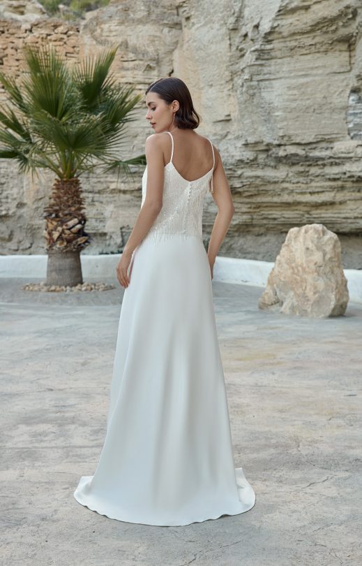 Топ свободного кроя выполнен из гипюра с бисерными нитями и трикотажной подкладкой. Тонкие бретельки декорированы вышивкой ручной работы. На спинке застежка на жемчужные пуговички.