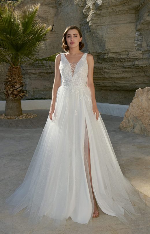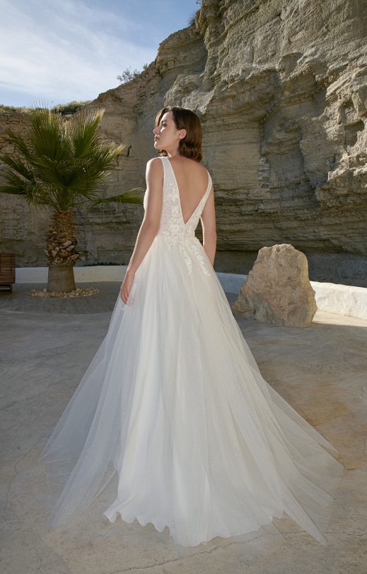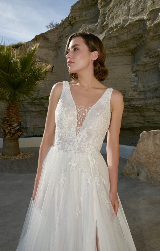 Платье А-силуэта выполнено из тюля с блестящим напылением в сочетании с гипюром, вышитым бисером и кружевными элементами. Лиф прозрачный с V-образными вырезами спереди и сзади, на спинке застежка на пуговички-жемчужинки. Многослояная юбка с небольшой сборкой на талии и декором из кружевных вышитых элементов, с разрезом спереди по левой ноге.
