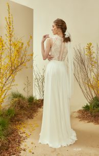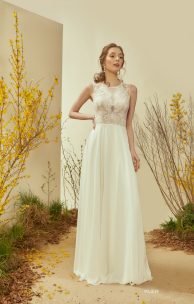 Женственное платье спокойного А-силуэта, выполнено из тонкого кружева с цветочным рисунком, тюля в горошек, с шифоновой юбкой-солнце. Нежный лиф с имитацией реглана, кокеточки на плечиках из тюля, слегка спущеная линия плеча. Горловина и проймы обработаны тонкой кружевной тесьмой. Спинка кружевная, с застежкой на пуговички-жемчужинки.
