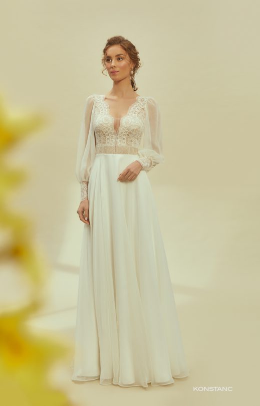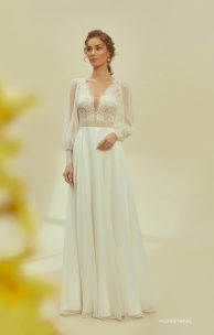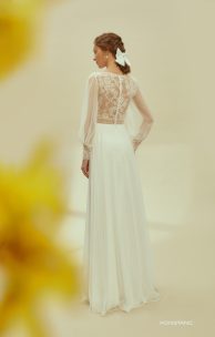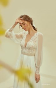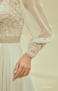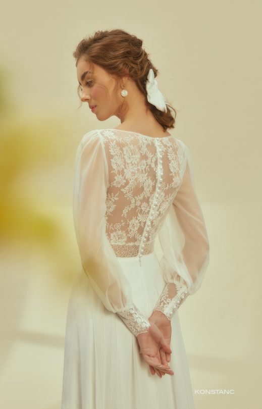 Изысканное платье выполнено их шелкового шифона в сочетании с шантильи. Вырез лифа спереди V-образный, по краям которого идет нежная кружевная кайма. Изящная спинка выполнена из гипюра с жемчужными пуговичками. Объемные рукава-буфы выполнены из шелкового шифона с кружевным высоким манжетом с пуговичками-жемчужинками. Легкий силуэт платья дополняет струящаяся юбка-солнце.