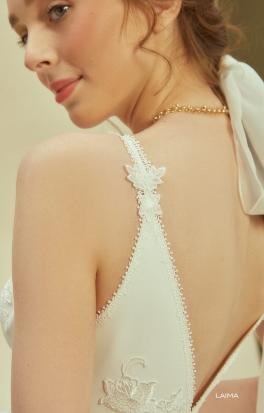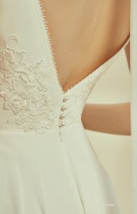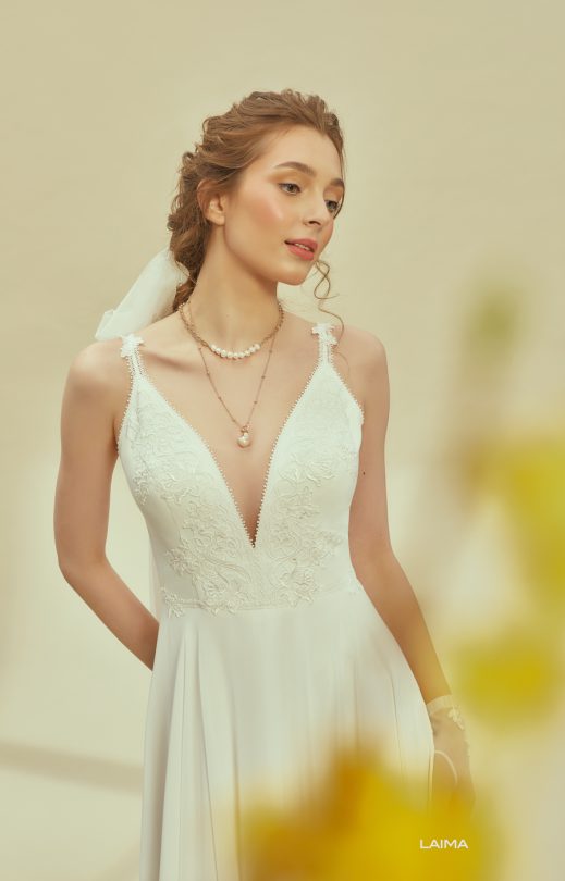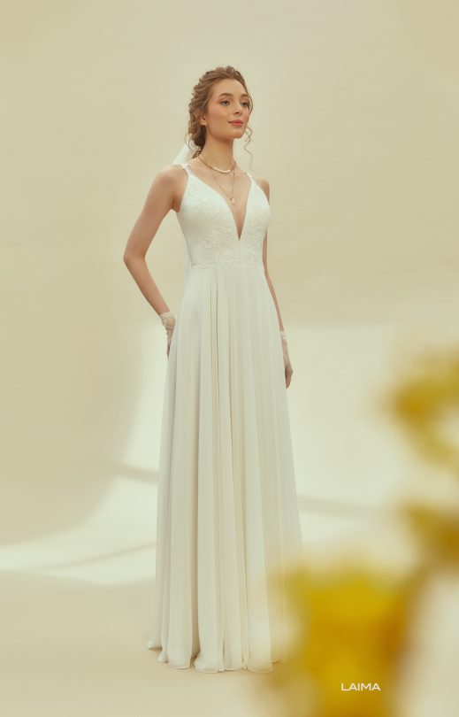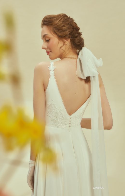 Женственное платье спокойного силуэта выполнено из шифона с летящей юбкой-солнце. Тонкие бретельки и V-образные вырезы спереди и на спинке очерчены тонкой кордовой каймой, которая также подчеркивает линию талии. Спинка застегивается на жемчужные пуговички.