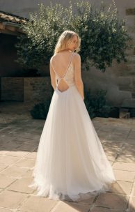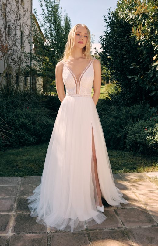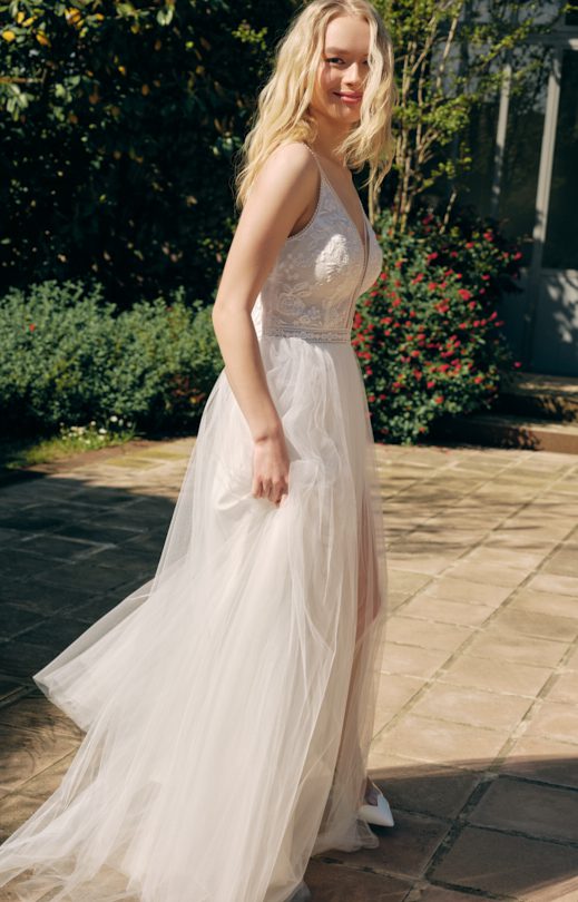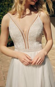 Нежное платье выполнено из тонкого гипюра, искусно сочетающегося с шелковым тюлем. Мягкий лиф из гипюра украшен кружевной каймой. Спинка лифа с фигурным вырезом застегивается на одну пуговицу-жемчужинку. Широкая кружевная кайма выделяет линию талии. Юбка-солнце многослойная, с небольшой сборкой по линии талии, дополнена боковым разрезом с левой стороны. На спинке спущенная линия талии и застежка молния.