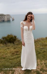 Блузон выполнен из тюля, декорированного кружевными элементами, вышитыми пайетками. На спинке застежка на пуговички-жемчужинки. Юбка-полурыбка с небольшим шлейфом.