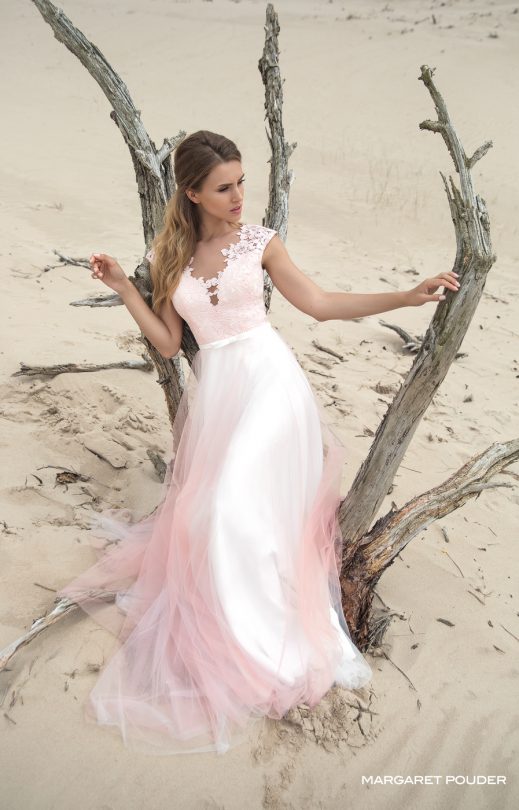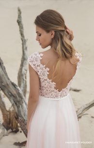 Очень женственное платье выполнено из кордового гипюра с крупными цветами и легкого тюля. Глубокий V-образный вырез на тюлевой кокетке оформляют кружевные лепестки хлопкового гипюра. Линия плеча непринужденно спущена, сзади жемчужные застежки. Легкость тюлевой юбке-солнце придает ее многослойность. Вариант тонированного пудрового цвета придает особую нежность данной модели.