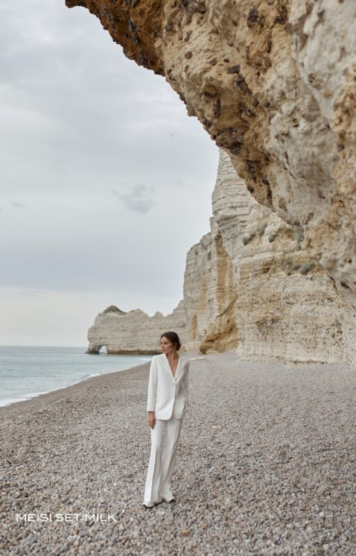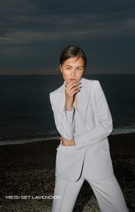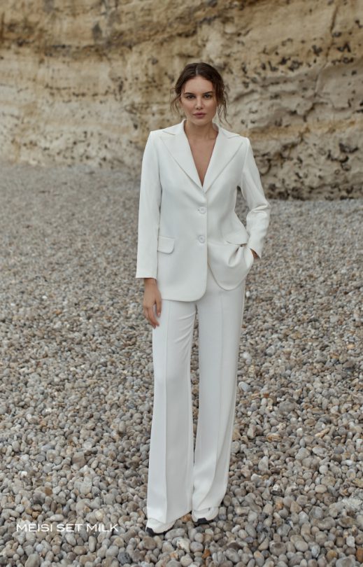 Комплект выполнен из креп-сатина. Однобортный жакет застегивается на две пуговицы, карманы с клапанами. Брюки на поясе, со стрелками, слегка расклешенные. Сбоку карманы с отрезными бочками. Застежка-молния в боковом шве.