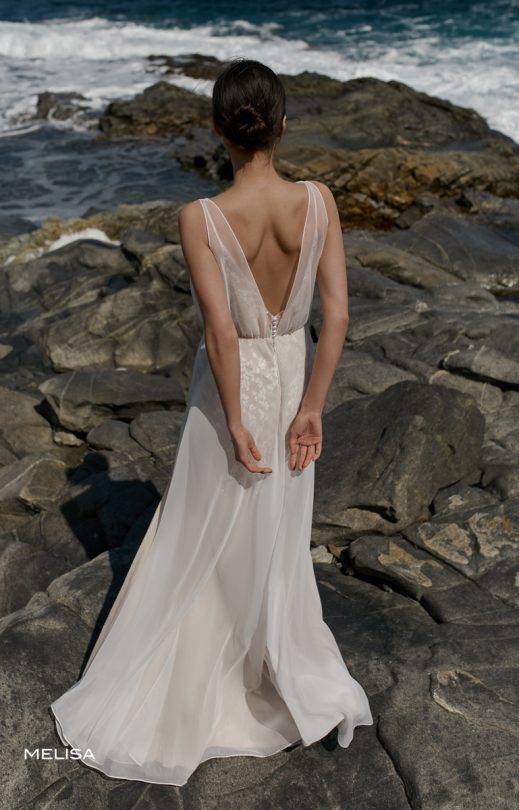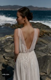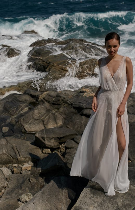 Нежное легкое платье выполнено из шелкового шифона в сочетании с кружевными элементами с цветочным принтом и шелковым тюлем с рисунком «полоски»ю Лиф без подкладки, прозрачный, с чашечками, натонких бретелях. На спинке глубокий вырез с замтежкой на жемчужные пуговички. Перед и спинка лифа с легкой драпировкой из шифона. Юбка многослойная: нижняя трикотажная юбка с разрезом силуэта «рыбка» с разрезом; верхняя юбка-полусолнце из шифона с разрезом с левой стороны.