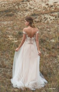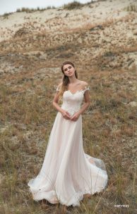 Романтичное платье спокойного А-силуэта. Лиф покрыт тонким гипюром и декорирован кружевными элементами с ручной вышивкой бисером, которые спускаются с лифа на юбку, что делает изгиб талии очень мягким. Изящный декор подчеркивает женственные вырез сердечком и слегка спущенную линию плеча. Все очарование модели дополняет широкая шнуровка на спине, а многослойная тюлевая юбка-солнце довершает весь романтичный образ.