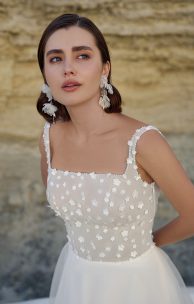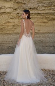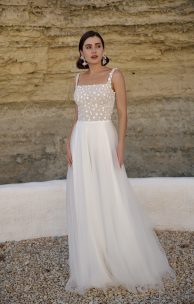 Тюлевое платье А-силуэта с многослойной юбкой-солнце. Лиф по переду из мягкого трикотажа, глубокая прозрачная спинка. Лиф декорирован вышивкой ручной работы цветочками и жемчужинками. Вдоль линии декольте, проймам и по линии талии также вышивка ручной работы мелким жемчугом. Застежка-молния в боковом шве.