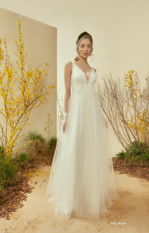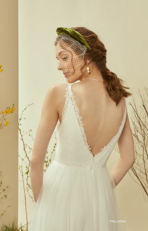 Женственное платье А-силуэта с пышной многослойной юбкой с искрящимся напылением. Мягкий лиф на тонких бретельках выполнен из тонкого гипюра. Линию декольте, глубокий вырез на спине и линию талии подчеркивают кордовые кружевные элементы.