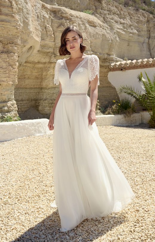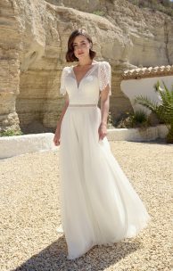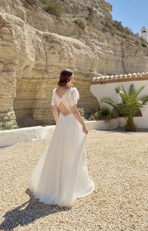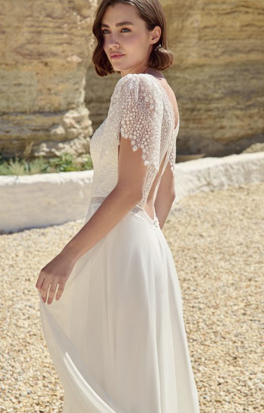 Платье А-силуэта выполнено из мягкого гипюра в сочетании с кружевной каймой на лифе и шелкового шифона на юбке-солнце. Мягкий гипюровый лиф с рукавами-крылышками, фигурная спинка с застежкой на пуговички-жемчужинки. Линия талии прозрачная из кружевной тесьмы и занижена сзади, сбоку прозрачные клинышки.