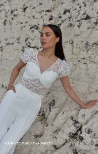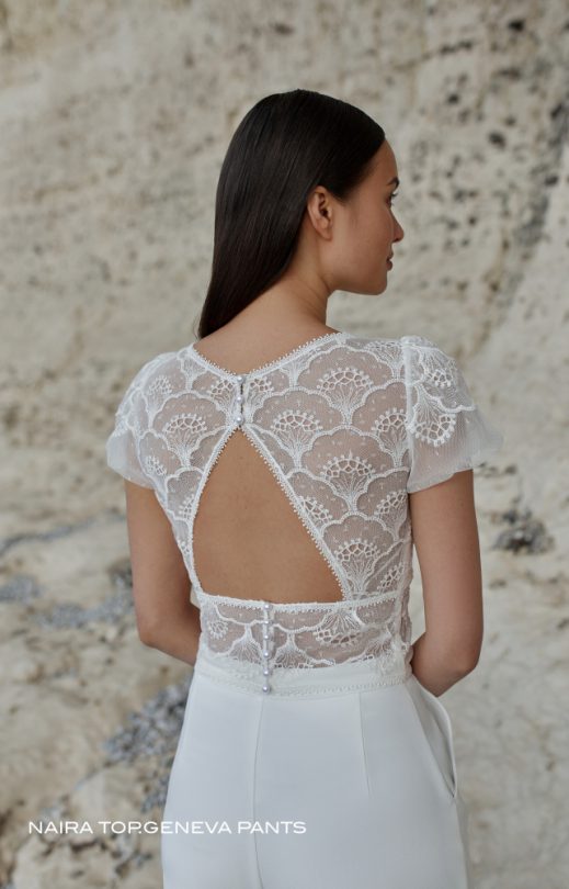 Топ выполнен из мягкого гипюра. Перед в област груди с трикотажной подкладкой. Сзади застежка на пуговички-жемчужинки. Рукав-фонарик.