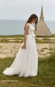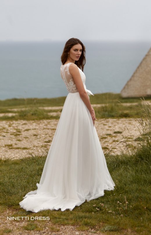 Платье выполнено из итальянского жаккарда в сочетании с тюлем в горошек. Спереди съемный декоративный бантик. Спинка из тюля в горошек декорирована кружевными элементами, застегивается на жемчужные пуговички. Многослойная юбка-солнце с мелкой сборкой на талии и небольшим шлейфом. Верхний слой юбки-тюль в горошек.