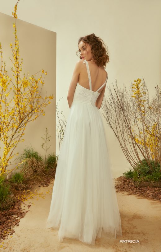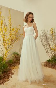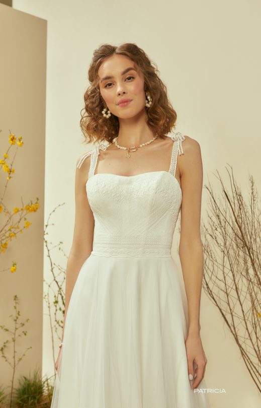 Нежное платье выполнено из сочетания тонкого гипюра с хлопковым кружевом. Лиф-корсет с застежкой-молнией на спине. Изящные кружевные бретельки дополнены элегантными бантиками из кружевной тесьмы. Воздушность платья подчеркнута многослойной тюлевой юбкой-солнце.