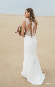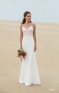 Очень изящное платье полуприлегающего силуэта со слегка расклешенной шифоновой юбкой с небольшим шлейфом. Лиф покрыт гипюрами разных фактур, линия соединения тюлевой кокетки с основой лифа декорирована деликатно вышитыми бисером, стелярусом и пайетками кружевными элементами. Тюлевая спинка с V-образным нижним вырезом заcтегивается на замочек-молнию и выложена тонкими кружевными элементами. Изящность талии придают фигурные кружевные элементы и тонкий поясок с бантиком.