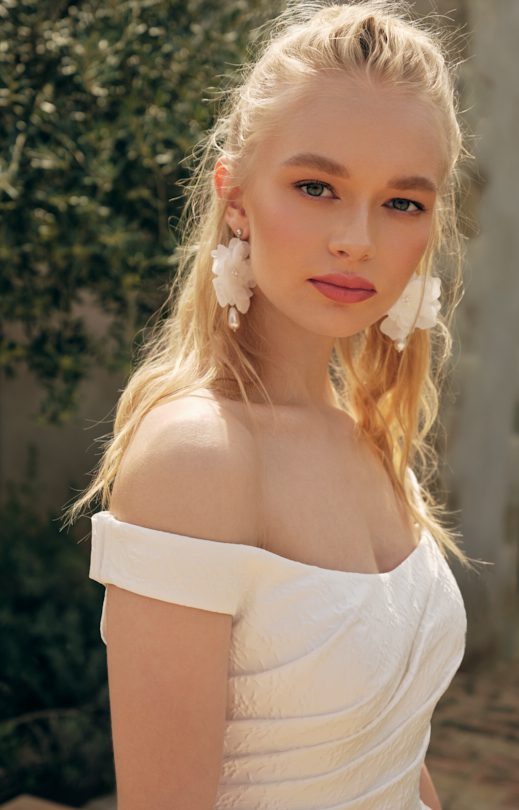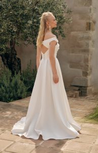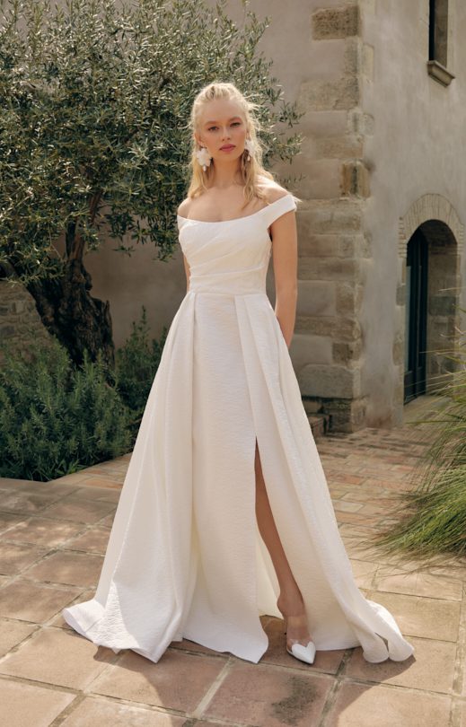 Утонченное платье А-силуэта выполнено из жаккарда с цветочным принтом. Лиф с вырезом «кармен» украшен мягкой драпировкой. На спинке — фигурный вырез, бретели оснащены удобными резиночками. Застежка на спине выполнена на обтяжные пуговицы. Юбка с запахом и разрезом с левой стороны. В боковых швах предусмотрены практичные карманы, а нижний край обработан лентой жесткости.