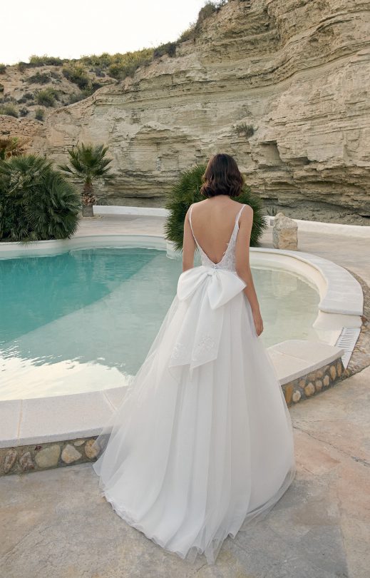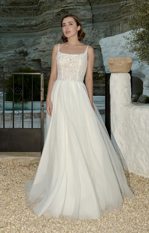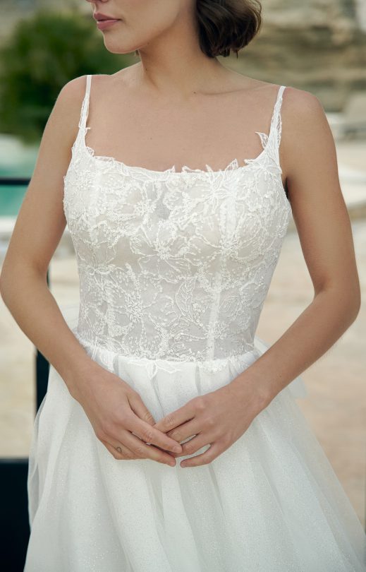Платье А-силуэта выполнено из тюля с блестящим напылением в сочетании с гипюром с цветочным принтом, вышитым пайетками. Прозрачный лиф на тонких бретельках, на спинке застежка на жемчужные пуговички. Юбка многослойная: верхний слой-тюль с блестящим напылением, нижний слой-органза. По линии талии на юбке складки. В комплекте идет съемный бант на кнопочках.