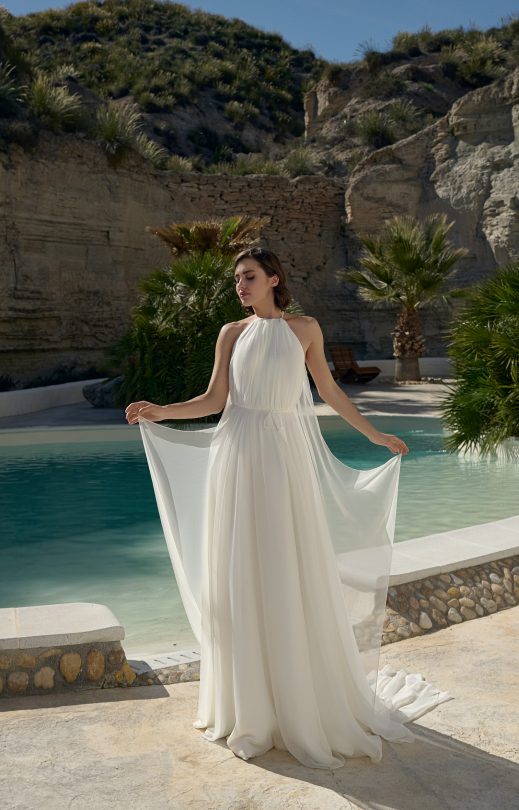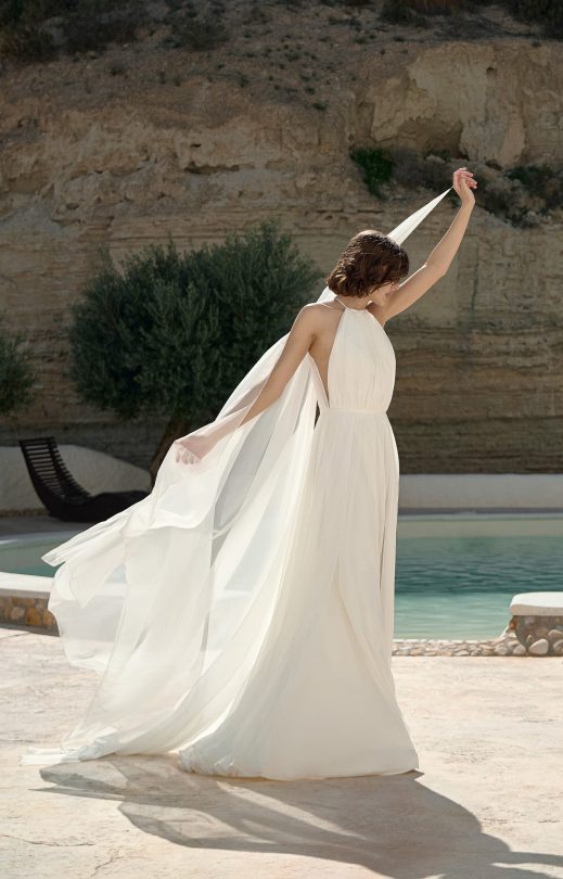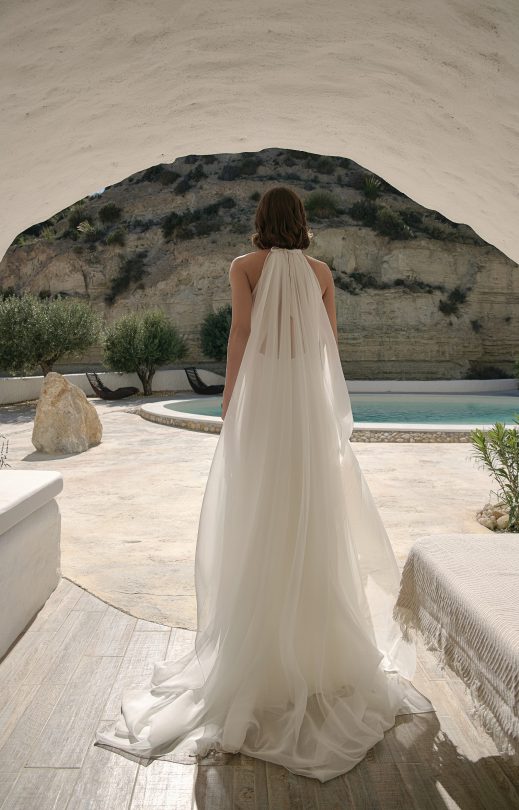 Платье А-силуэта выполнено из шелкового шифона. Перед и спинка с мягкими драпировками, на боках прозрачные тюлевые клинышки. На горловине завязка с бантиком сзади. Юбка-солнце с мелкой сборкой по линии талии. В комплекте съемный кейп из шелкового шифона и тонкий поясок, завязывающийся бантиком.