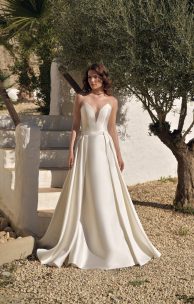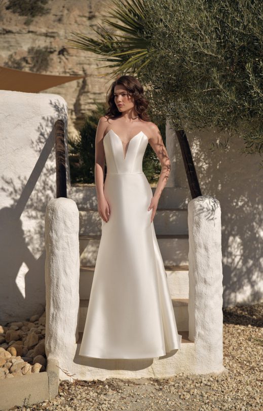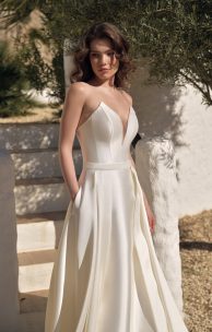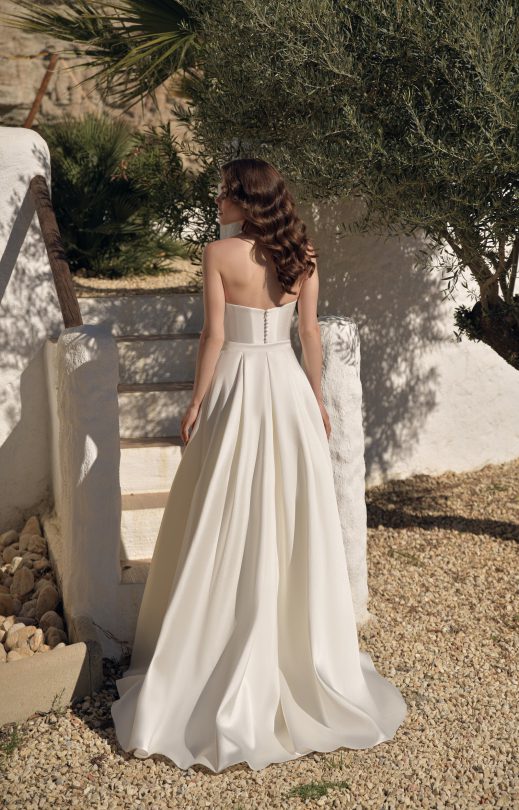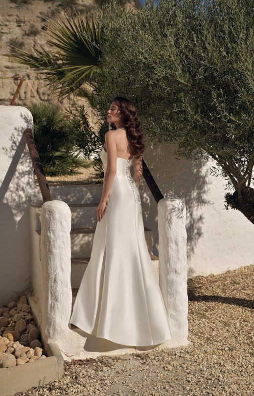 Платье с юбкой-полурыбка выполнено из микадо. Лиф-корсет с застежкой-молнией, вдоль которой пришиты декоративные обтянутые тканью пуговички.
