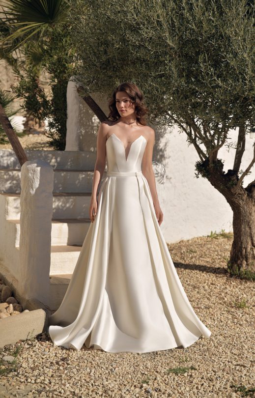 Распашная юбка из микадо с глубокими складками спереди и сзади, по переду застегивается на потайные пуговички.