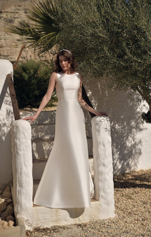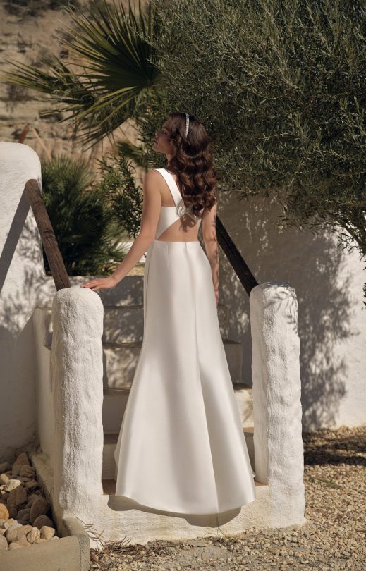Платье силуэта полурыбка выполнено из микадо. Фигурная спинка с широкими бретелями застегивается на пуговички-жемчужинки.